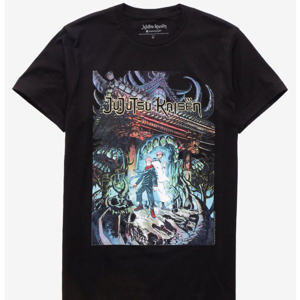 The Jujutsu Kaisen Poster T-shirt is one of several anime collaborations from Hot Topic. This graphic tee features an elaborate design of Yuji and the cursed spirit Sukuna in a fantasy-like shrine. Compared to the live-action version, this print appears to be straight out of the manga itself—as evidenced by the fine pen details and washed-out colors.