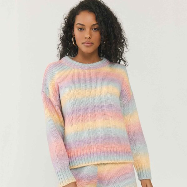 The Poppy Ombre Sweater is simply enchanting. Need we say more? This ensemble, which is offered as a top and bottom set, features an ombré effect in pastel rainbow colors that are perfect for spring mornings. With its round neckline and dropped shoulders, this is exactly the kind of outfit you want to snuggle up in with a cup of hot tea.