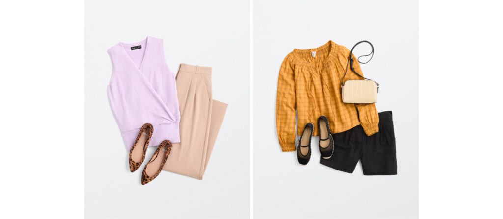 When choosing clothing for a heart-shaped figure, it is important to select garments that make the shoulders appear slimmer and emphasize the waist. Our stylists recommend tops that create vertical lines and styles that add volume around the hips to achieve a balanced silhouette. “V-neck and wrap-style tops are ideal for the heart shape—they create a flattering line and draw attention to your defined waist,” says stylist Erin.