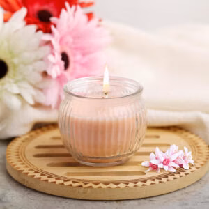 Use fresh, floral, and fruity scented candles with pastel-colored or transparent holders.