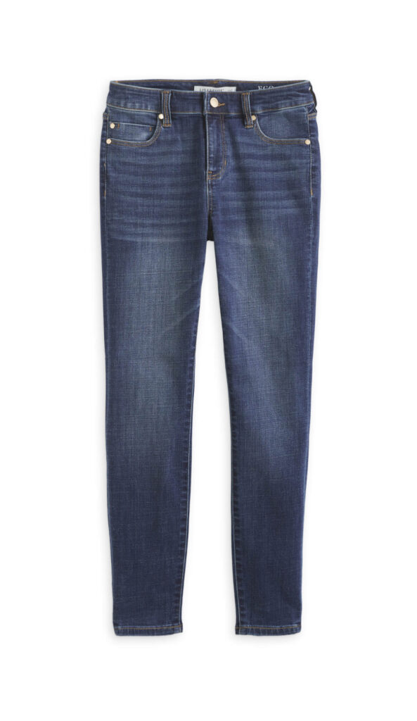 With a waistline that sits about 2 inches above the belly button, high-waisted jeans create a more defined silhouette. High-waisted jeans make your legs look longer and look great with tucked-in shirts and shorter tops. A tip from our stylist Molly: “Choose a style with stretch for ultimate comfort all day long—look for styles with about 2% stretch or 3% if you want extra freedom of movement.”