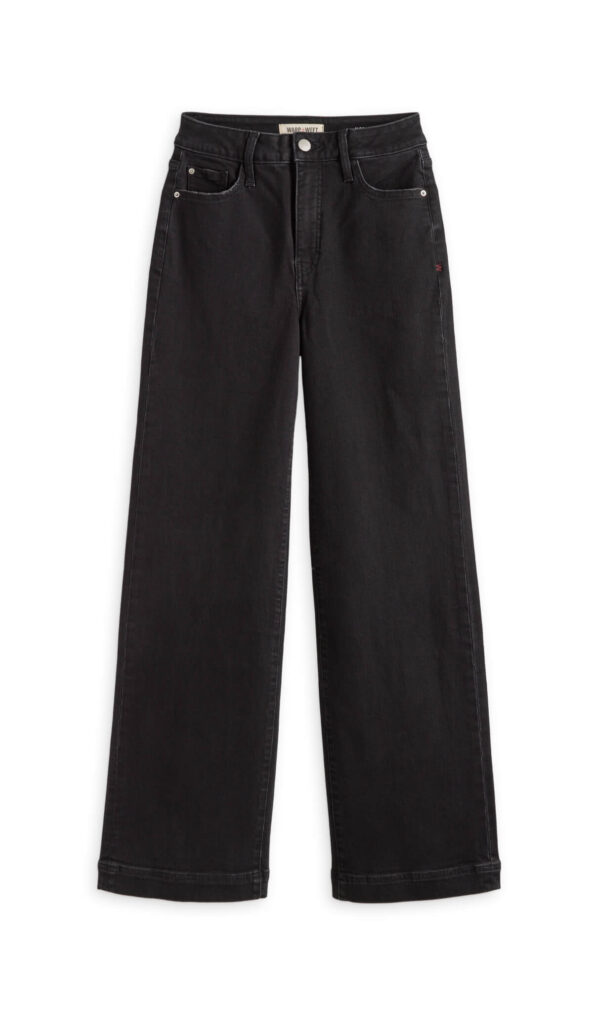 We love wide-leg jeans with floor-length legs and like to pair them with block or wedge heels. Wear them with a top that ties at the front to emphasize the waist, or play with proportions by pairing wide-leg jeans with a flowing oversized top (don’t forget to tuck the top into the skirt!).